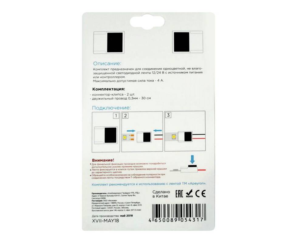 Коннектор для одноцветной светодиодной ленты 3528/2835/5050/5630 8-10мм Apeyron 12/24В 2шт 09-65