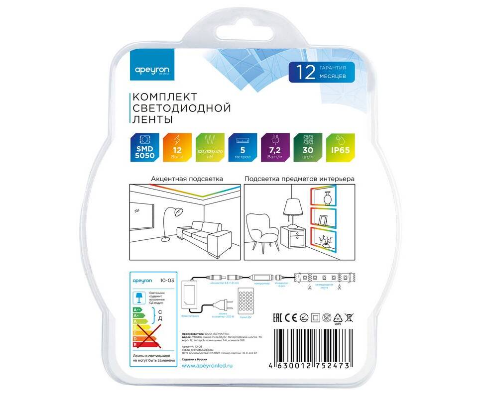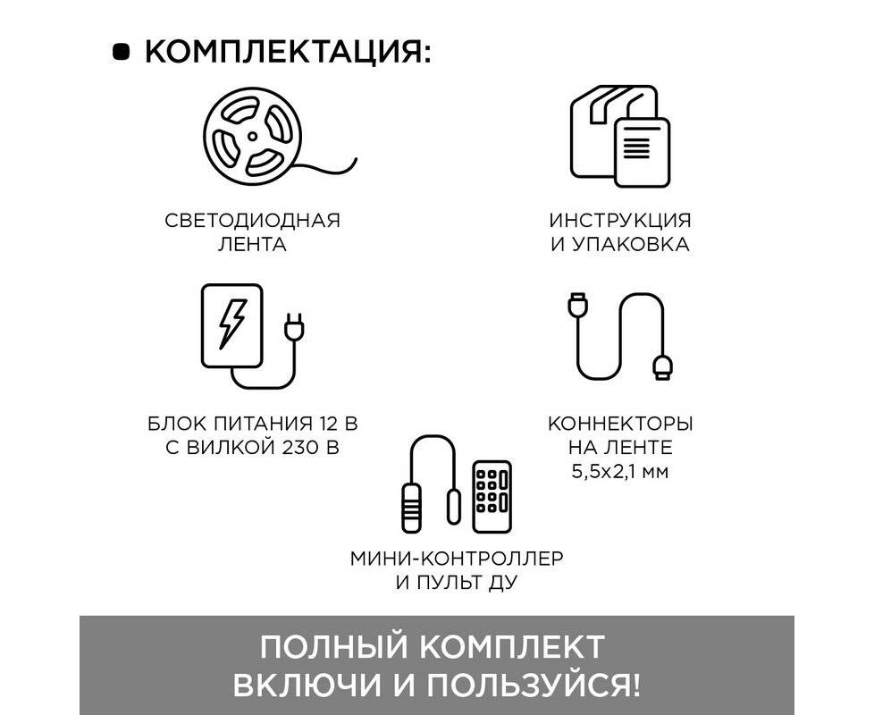 Комплект светодиодной ленты Apeyron 12В 7.2Вт/м smd 5050 30 д/м IP65 5м RGB (блок, коннектор, контро