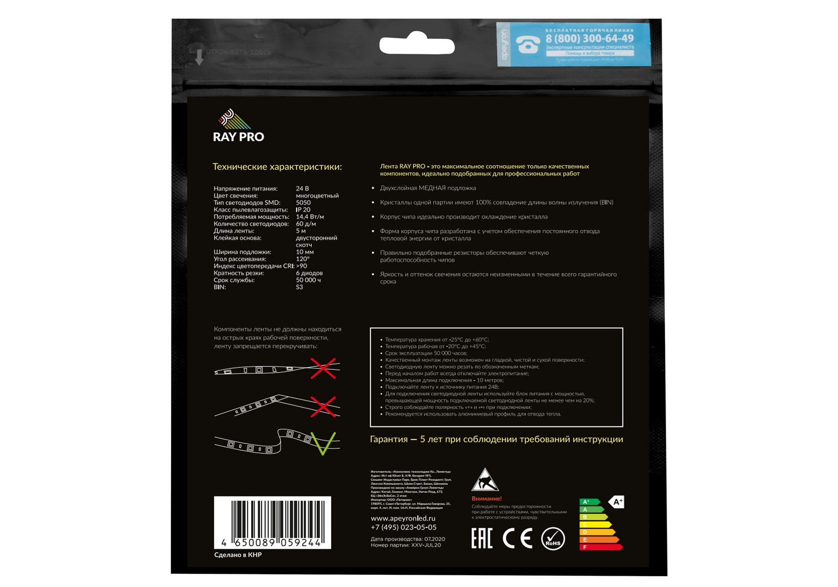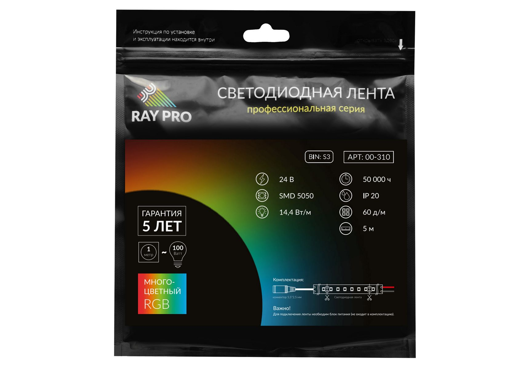 Cветодиодная лента Apeyron 24В 14,4Вт/м smd5050 60д/м IP20 5м RGB 00-310
