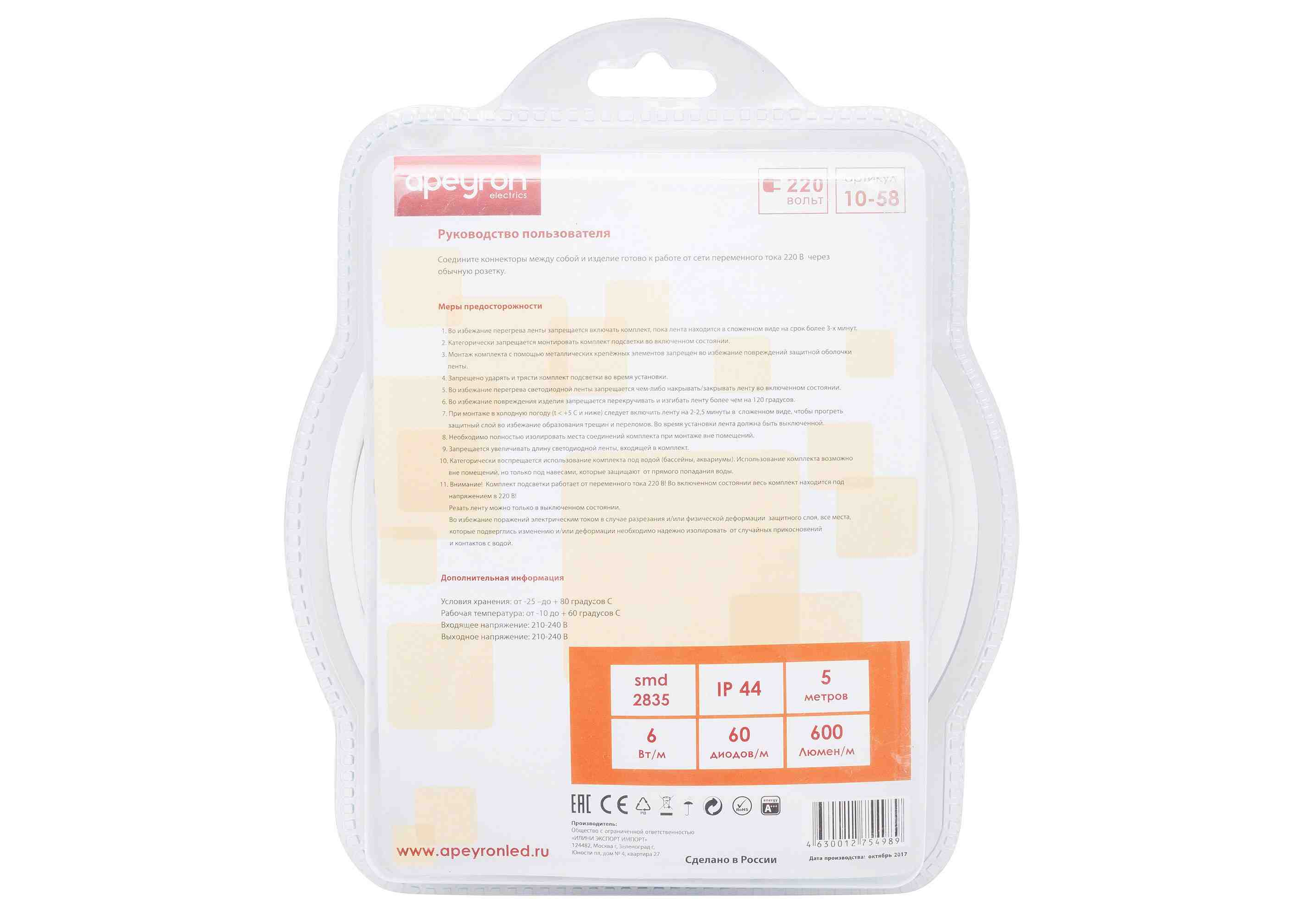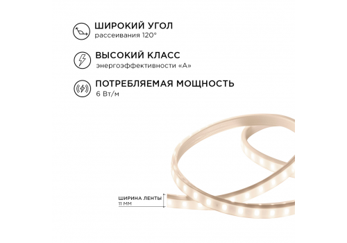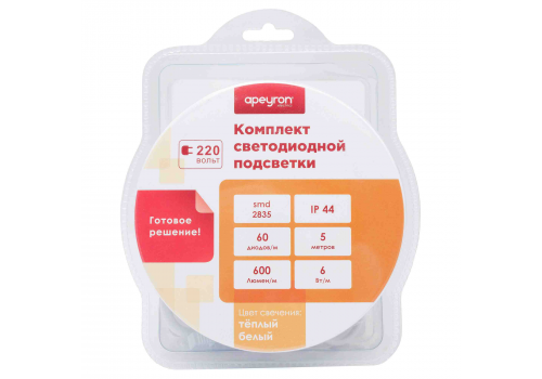 Комплект светодиодной ленты Apeyron 220В 6Вт/м smd2835 60д/м IP65 5м 3000К (сетевой шнур, заглушка,