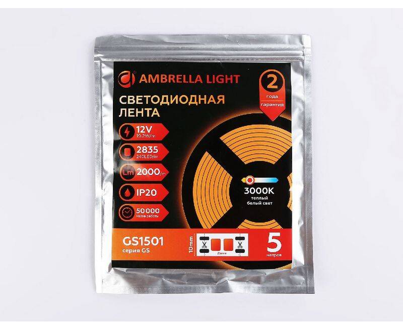 Светодиодная лента Ambrella Light LED Strip 12В 2835 19,2Вт/м 3000K 5м IP20 GS1501