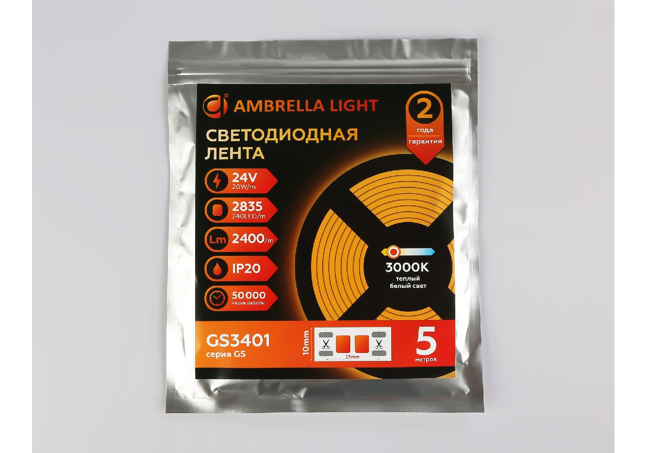 Светодиодная лента Ambrella Light LED Strip 24В 2835 20Вт/м 3000K 5м IP20 GS3401