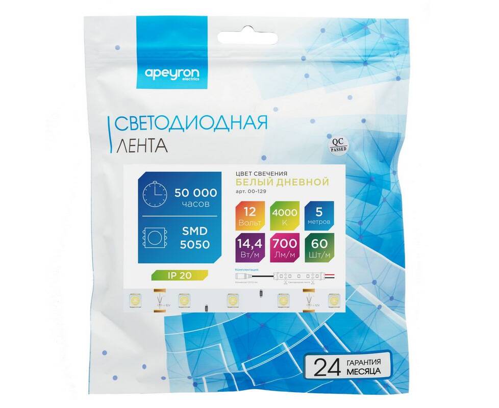 Светодиодная лента Apeyron 12В СТ 14,4Вт/м smd5050 60д/м IP20 700Лм/м 5м 4000К 00-129