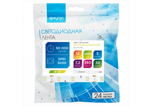 Светодиодная лента Apeyron 12В СТ 7,2Вт/м smd5050 30д/м IP20 360Лм/м 5м 4000К 00-149