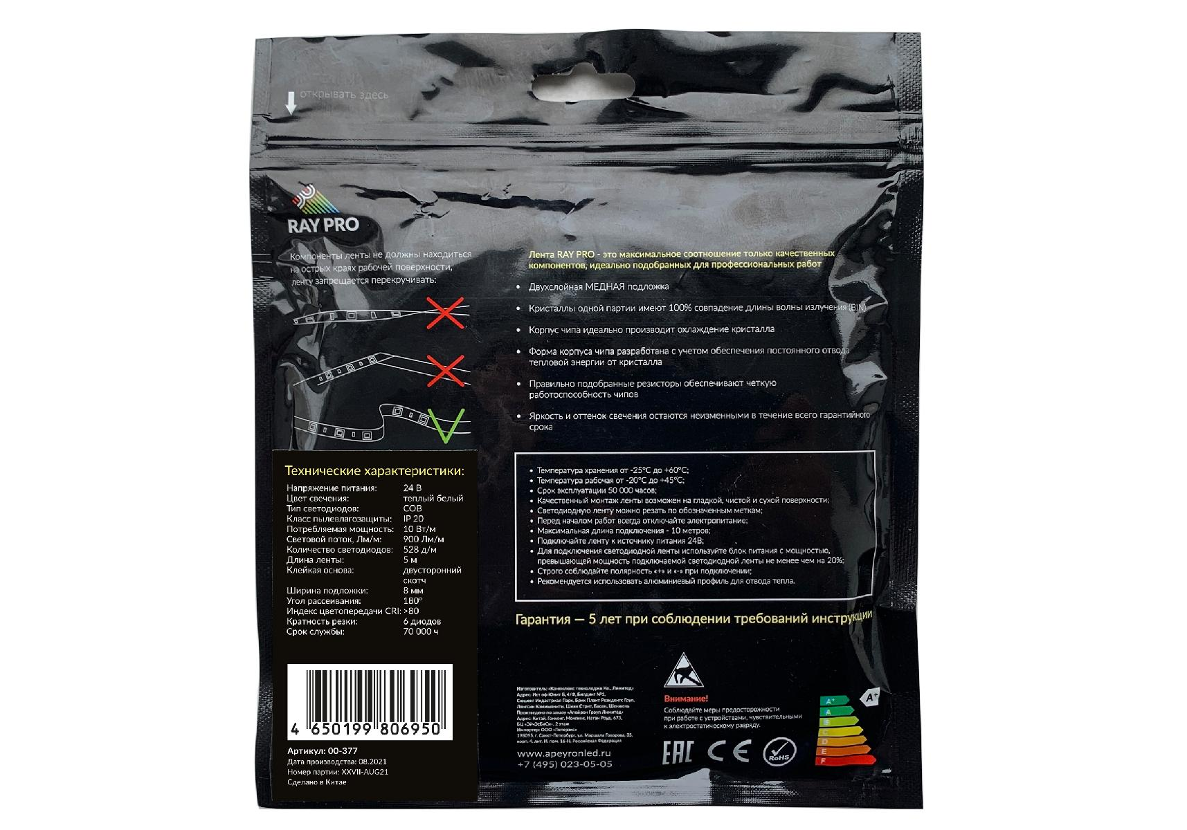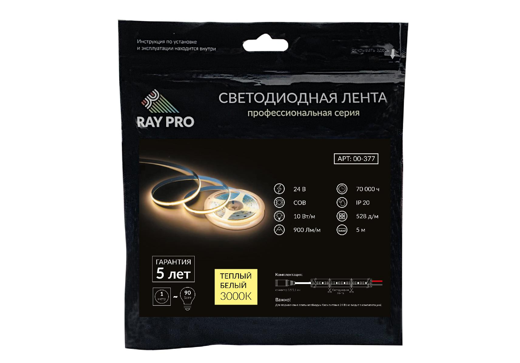 Светодиодная лента Apeyron 24В 10Вт/м COB, 528д/м IP20 900Лм/м 5м 3000К 00-377