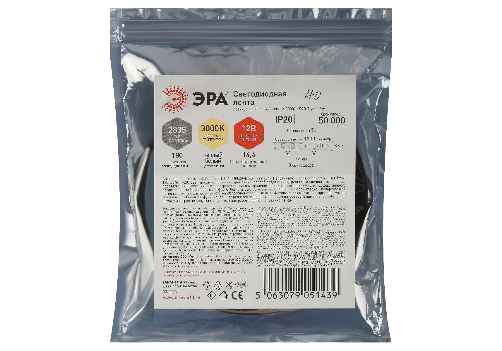 Светодиодная лента Эра 12В 2835 14,4Вт/м 3000K 5м IP20 LS2835-14,4-180-12-3000K-IP20-1 year-5m Б0059
