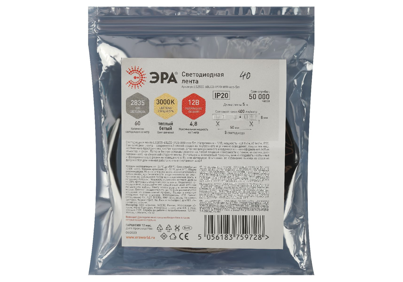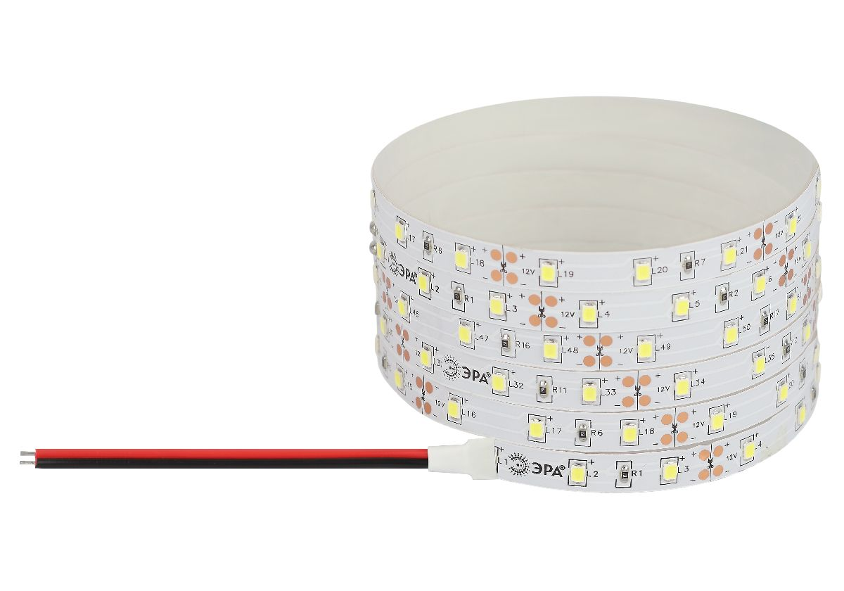 Светодиодная лента Эра 12В 2835 4,8Вт/м 3000K 5м IP20 LS2835-60LED-IP20-WW-eco-5m Б0035587
