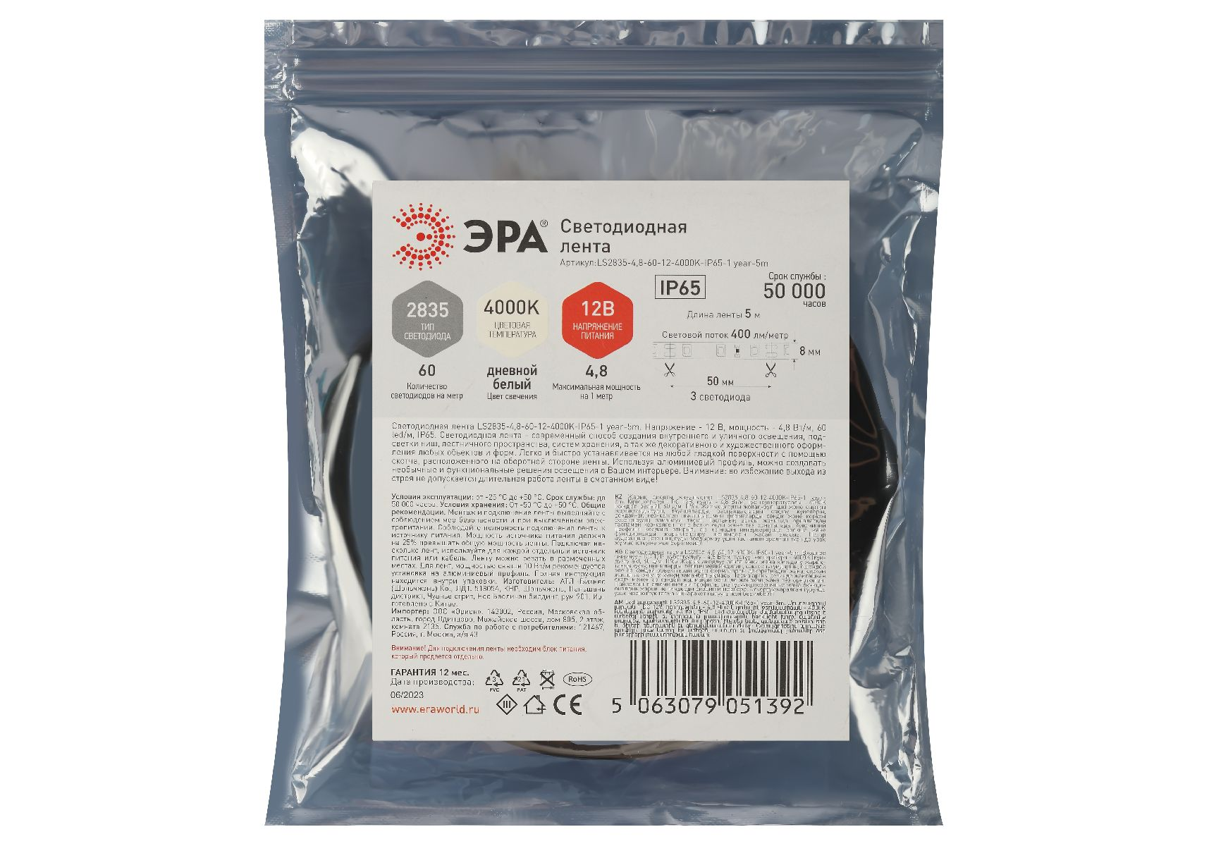 Светодиодная лента Эра 12В 2835 4,8Вт/м 4000K 5м IP65 LS2835-4,8-60-12-4000K-IP65-1 year-5m Б0059901