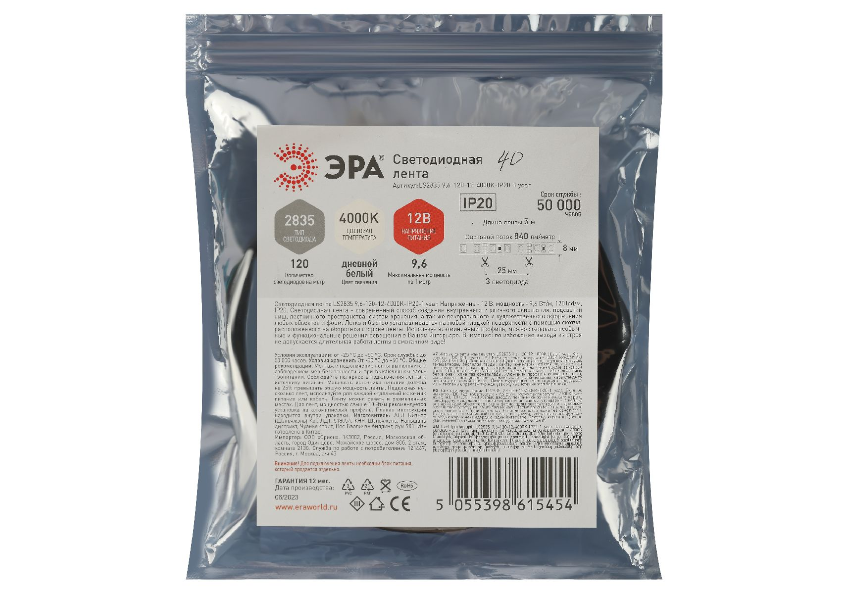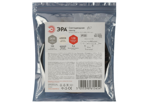 Светодиодная лента Эра 12В 2835 9,6Вт/м 4000K 5м IP20 LS2835-9,6-120-12-4000K-IP20-1 year Б0053968