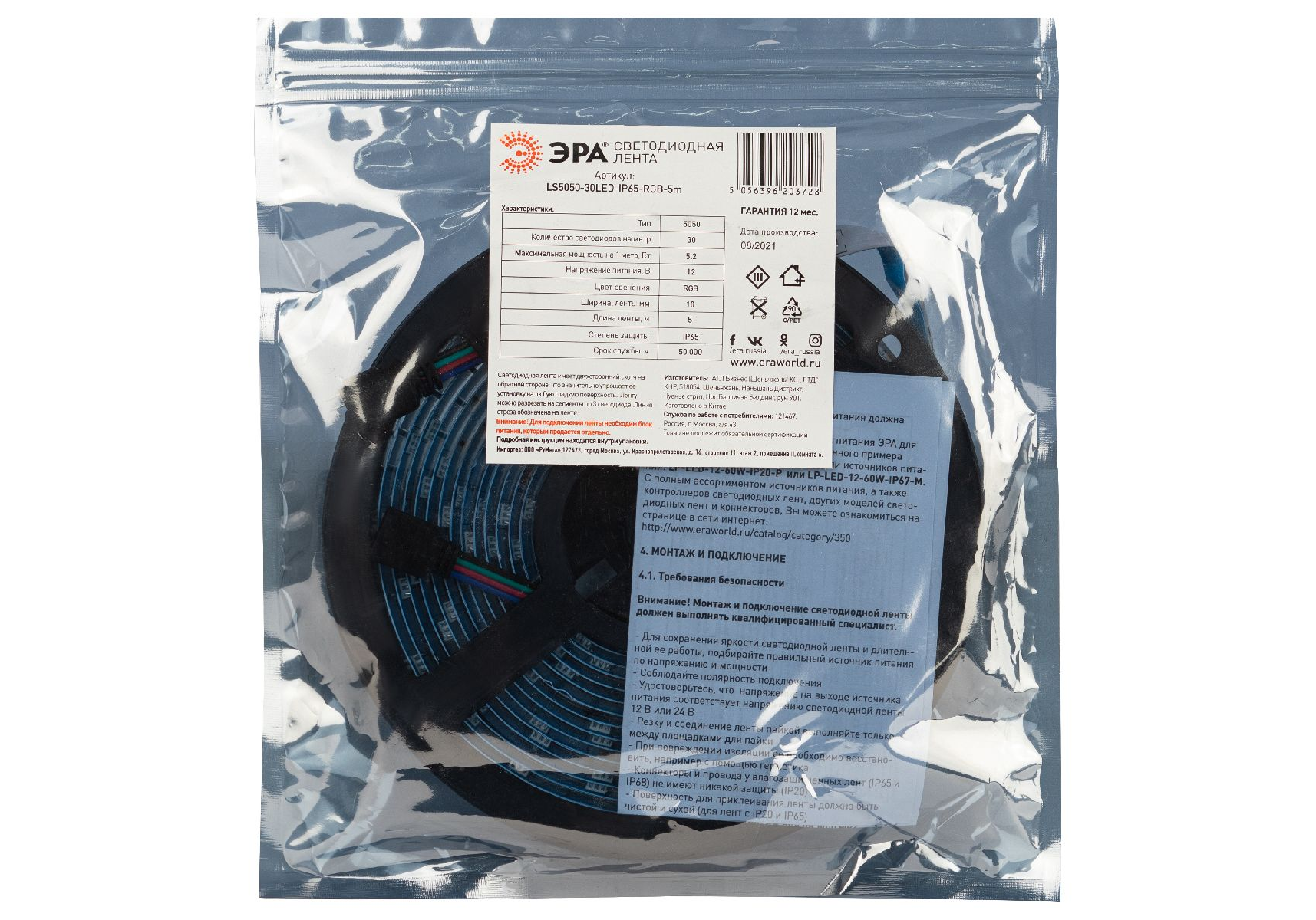 Светодиодная лента Эра 12В 5050 5,2Вт/м RGB 5м IP65 LS5050-30LED-IP65-RGB-5m C0043044