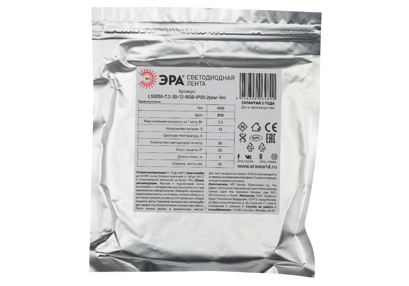 Светодиодная лента Эра 12В 5050 7,2Вт/м RGB 5м IP20 LS5050-7,2-30-12-RGB-IP20-2year-5m KU-5050AD-30D