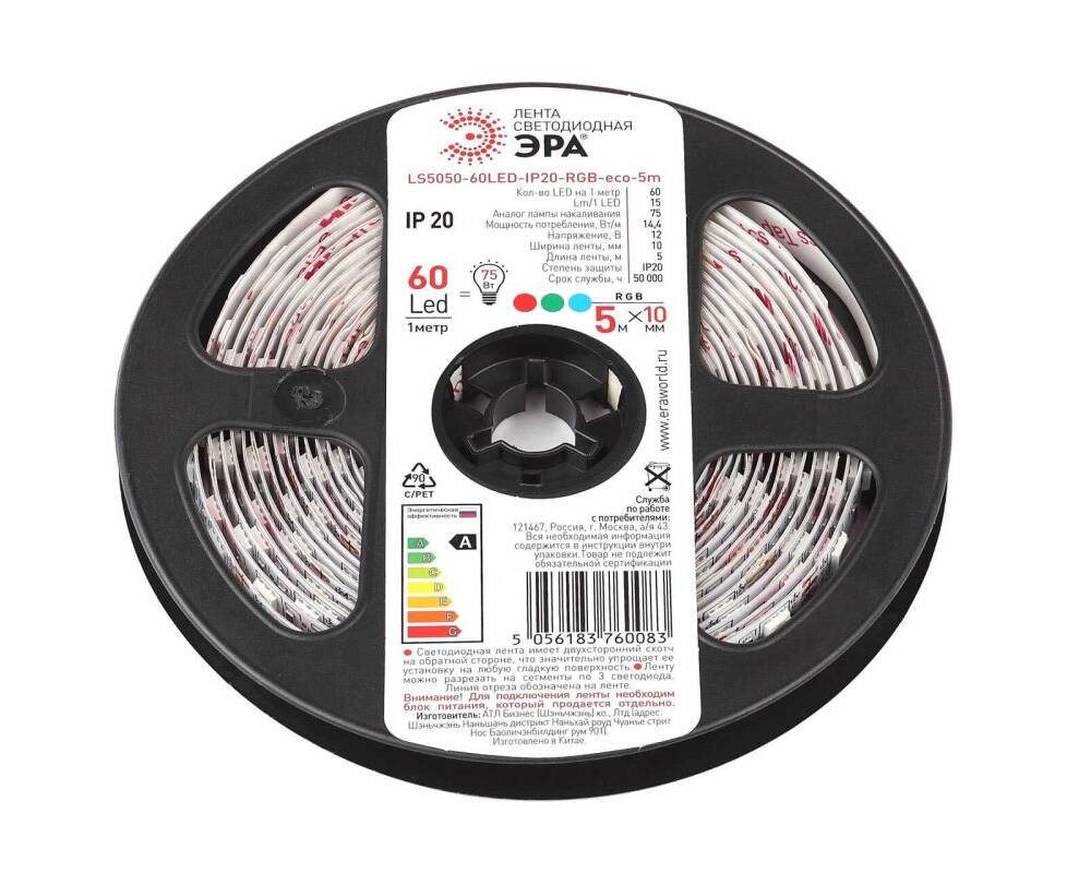 Светодиодная лента ЭРА 14,4W/m 60LED/m 5050SMD RGB 5M LS5050-14,4-60-12-RGB-IP20-1 year-5m Б0035606