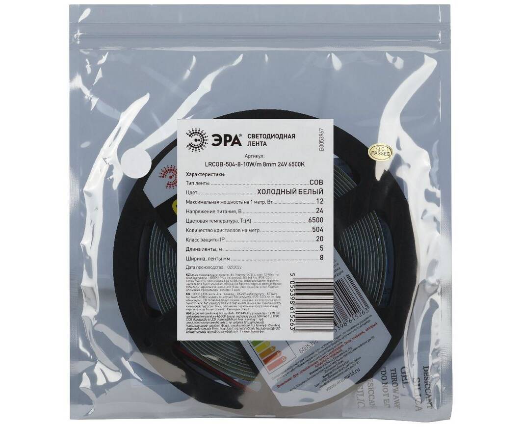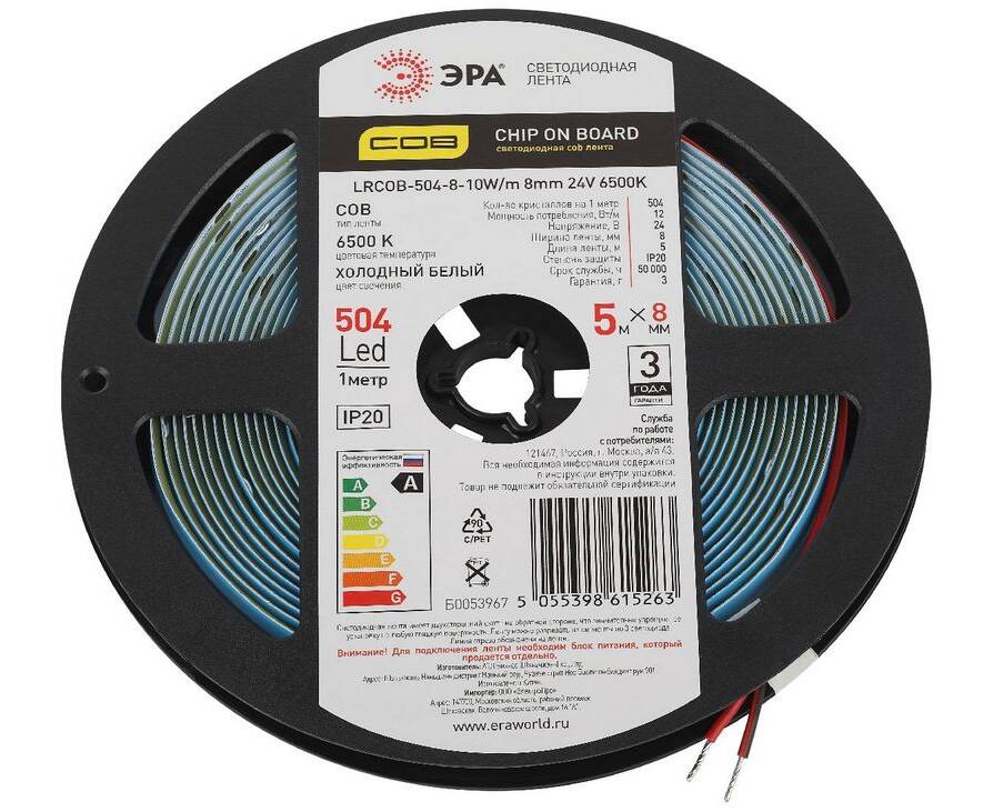 Светодиодная лента Эра 24В 10Вт/м 6500K 5м IP20 LRCOB-504-8 10W/m 8mm 24V 6500K 3year Б0053967