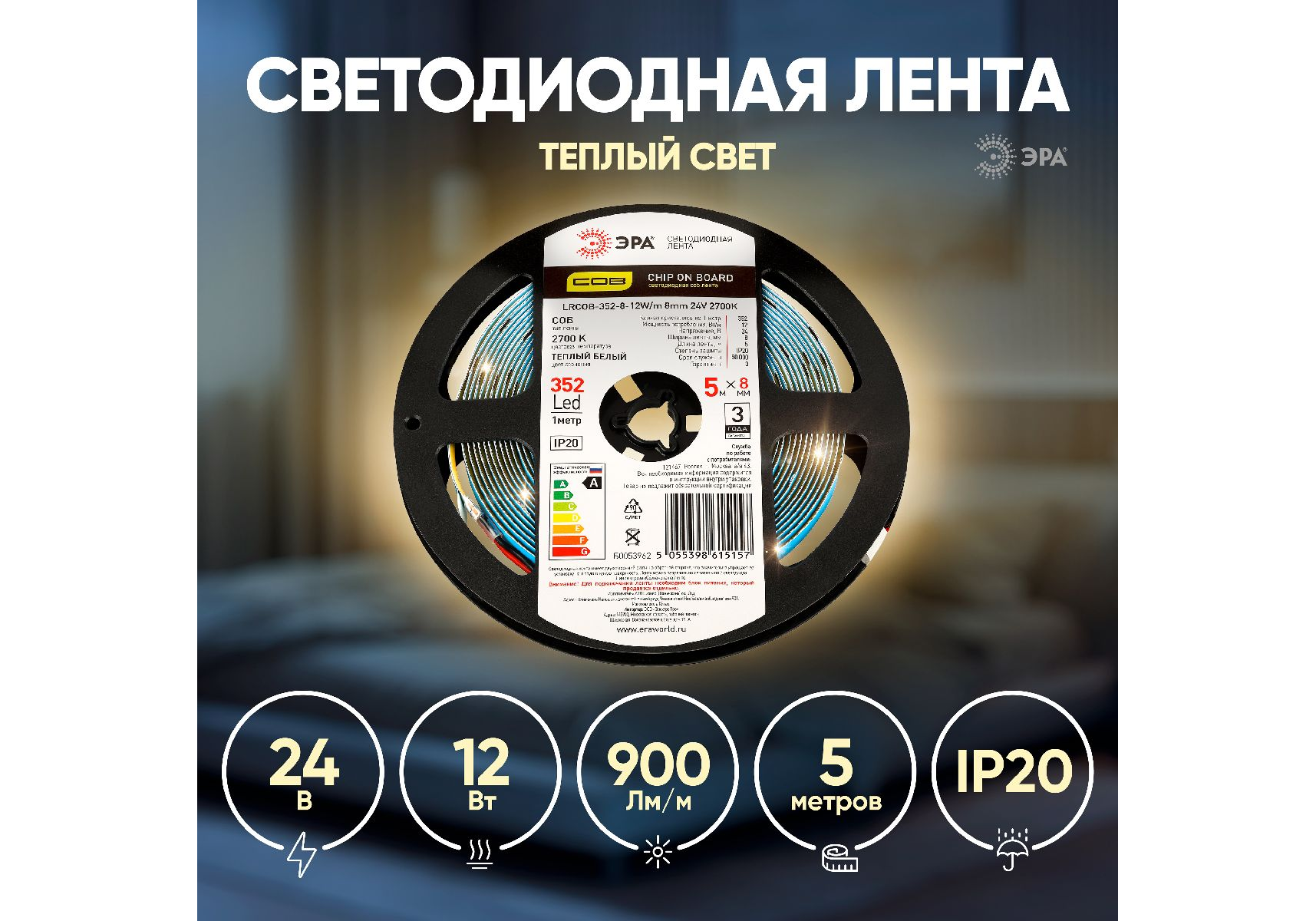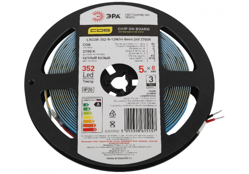 Светодиодная лента Эра 24В 12Вт/м 2700K 5м IP20 LRCOB-352-8 12W/m 8mm 24V 2700K 3year Б0053962
