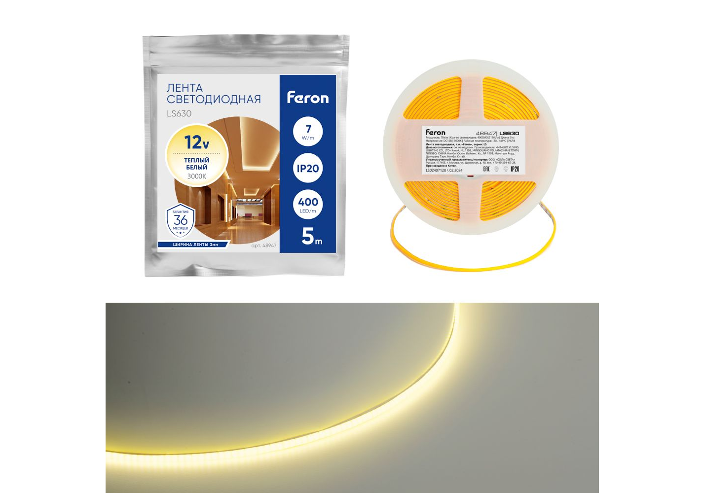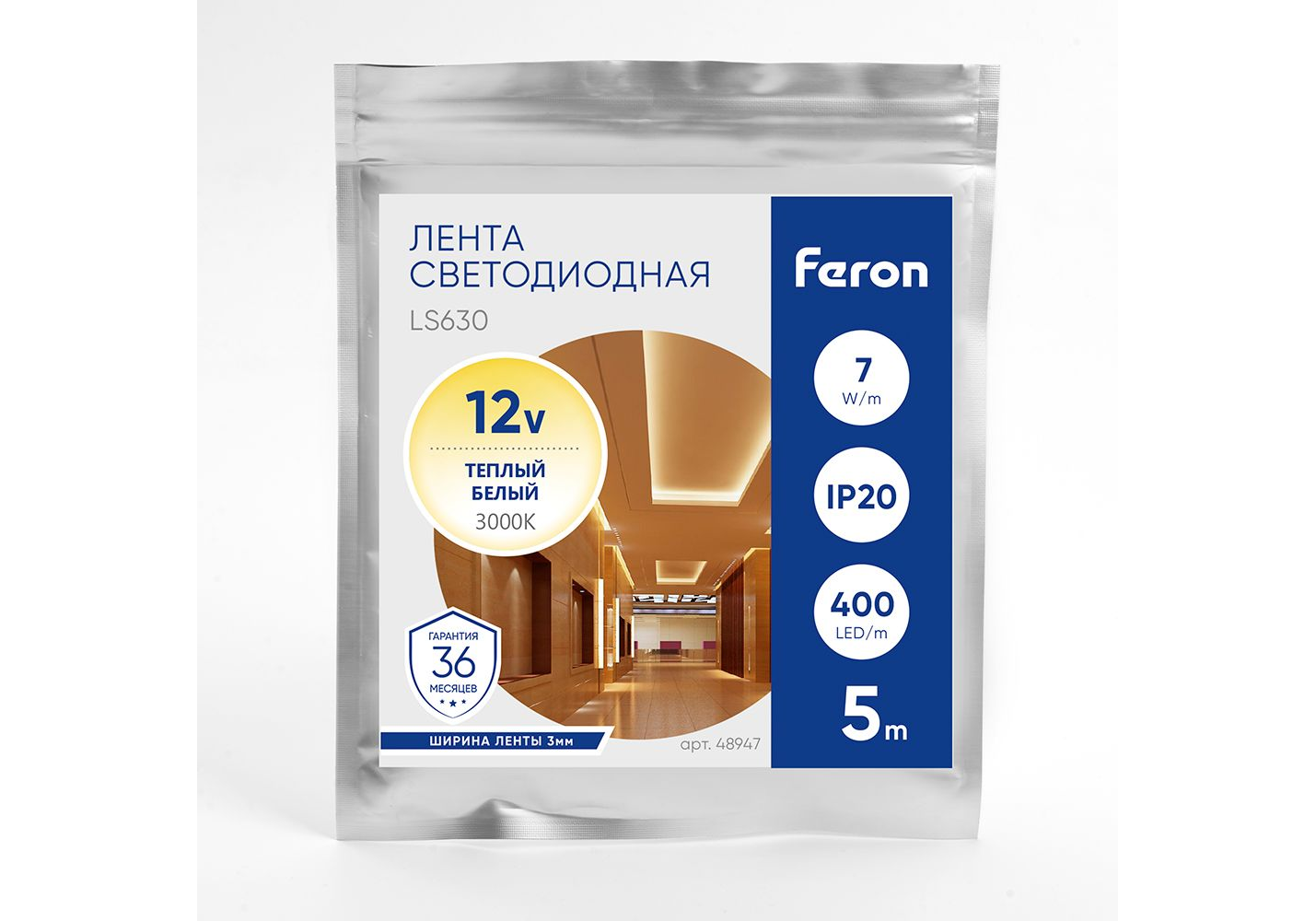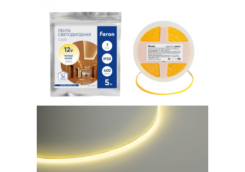 Светодиодная лента Feron 7W/m 400LED/m COB теплый белый 5М LS630 48947