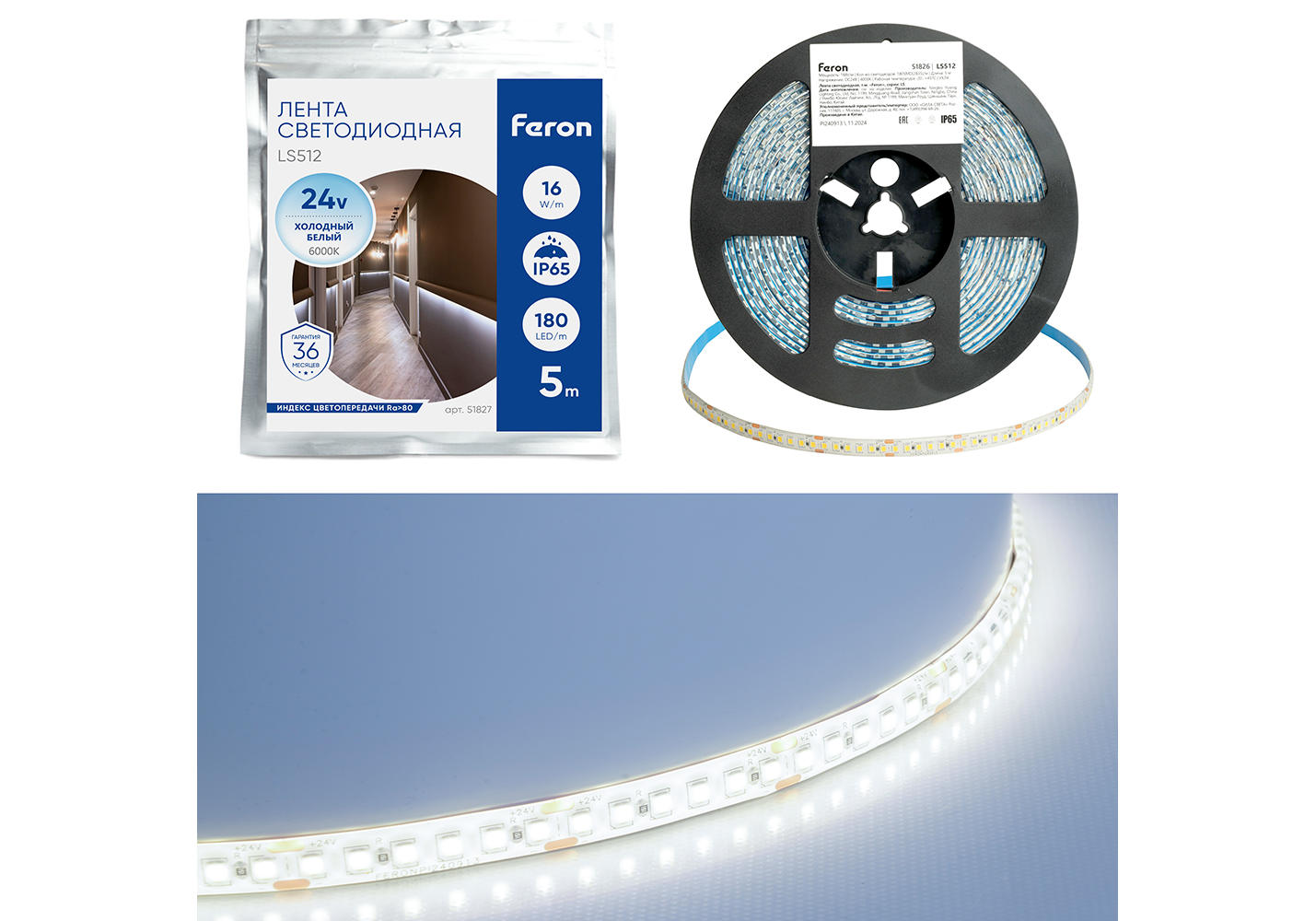 Светодиодная лента Feron LS512 24В 2835 16Вт/м 6000К 5м IP65 51827