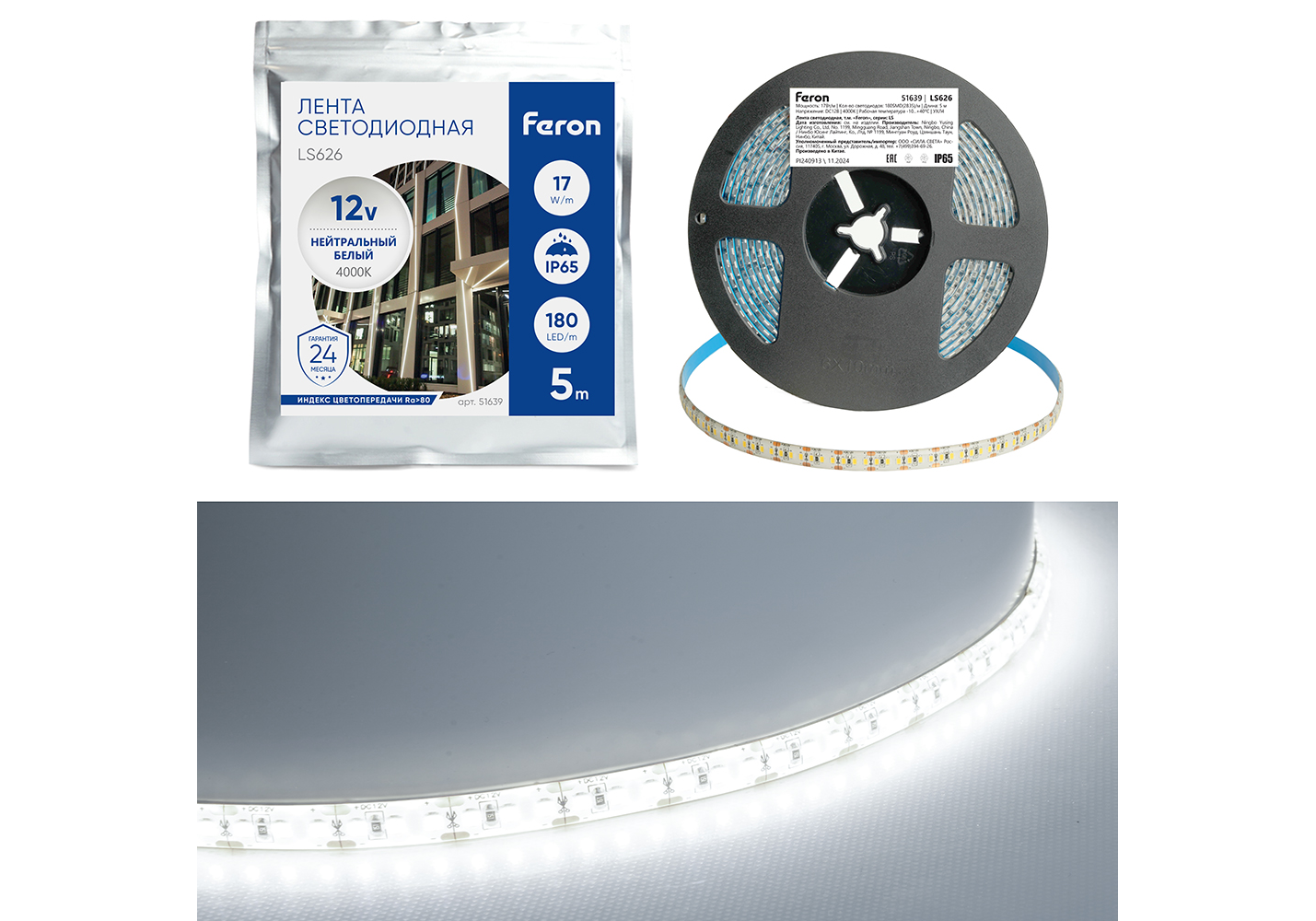 Светодиодная лента Feron LS626 12В 2835 17Вт/м 6500К 5м IP65 51640