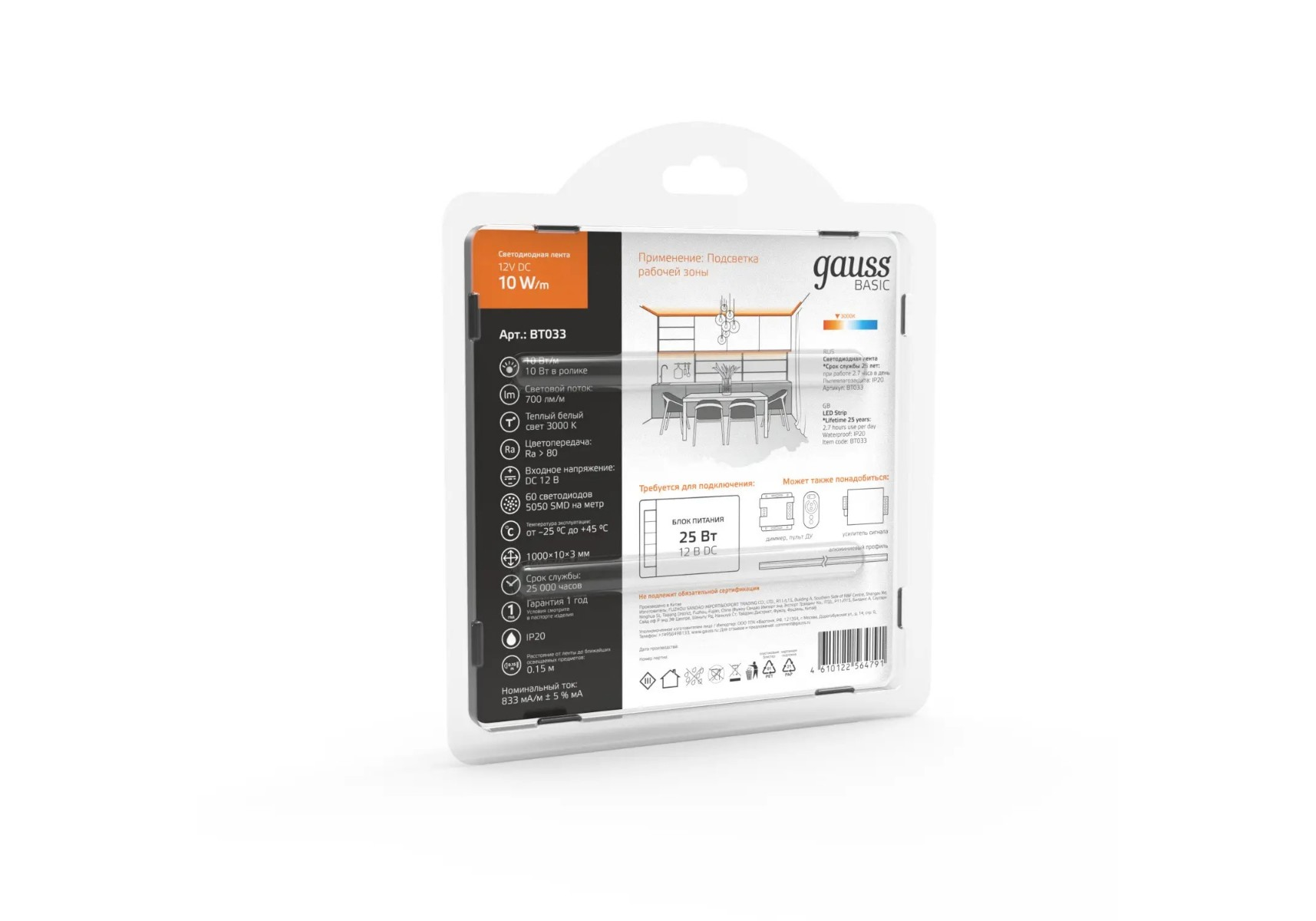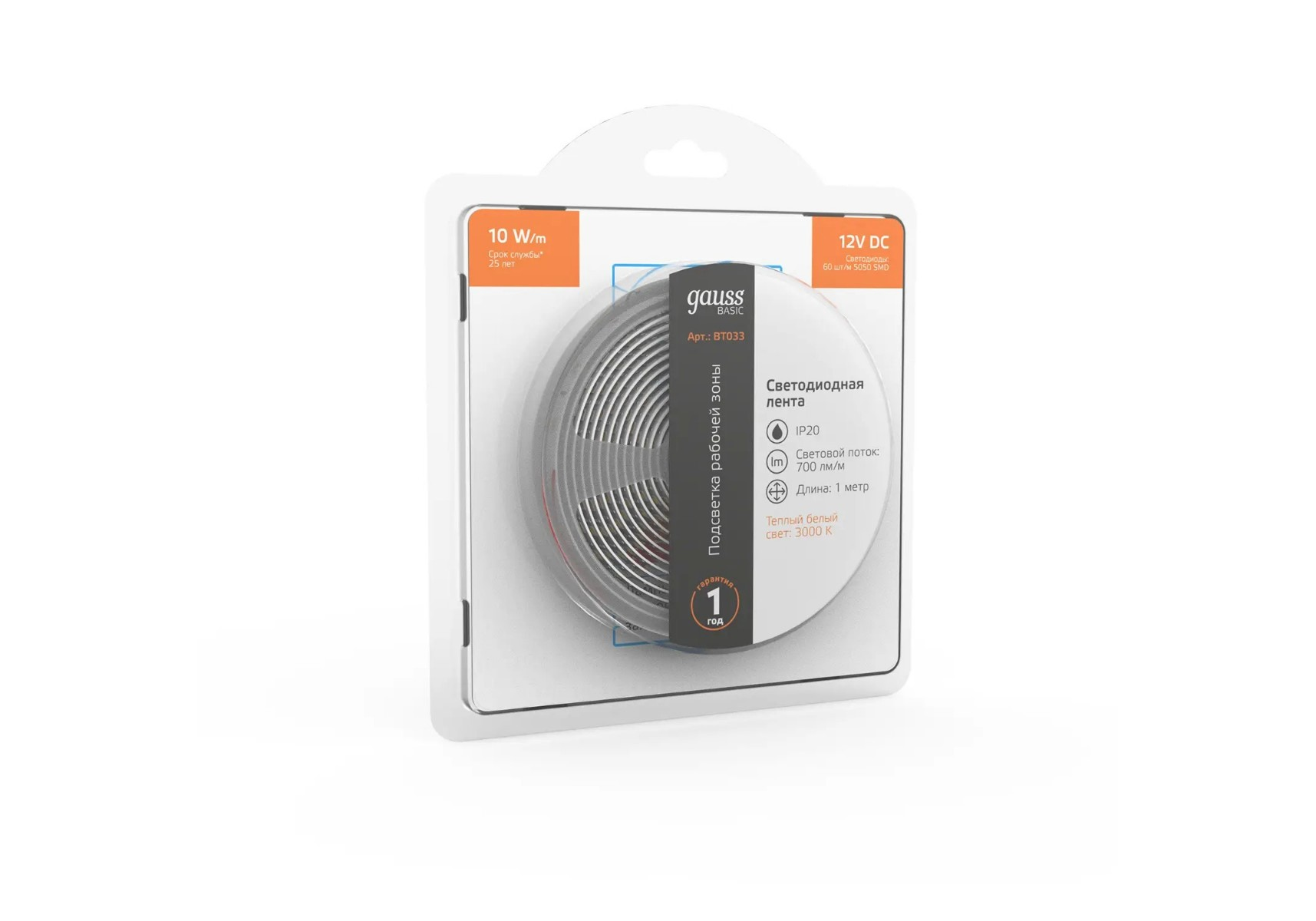 Светодиодная лента Gauss 10W/m 60LED/m 5050SMD теплый белый 1M BT033