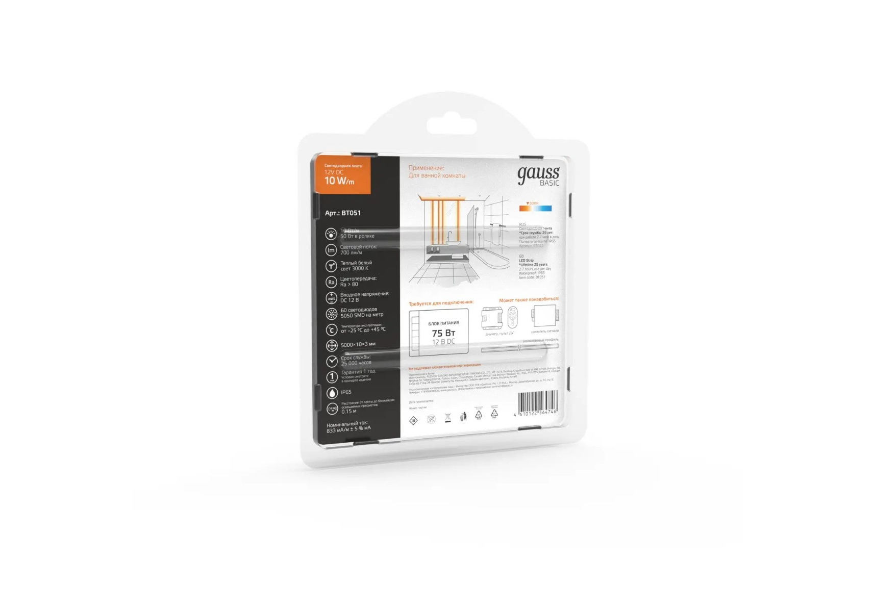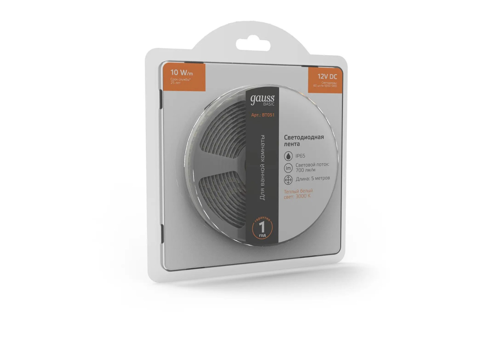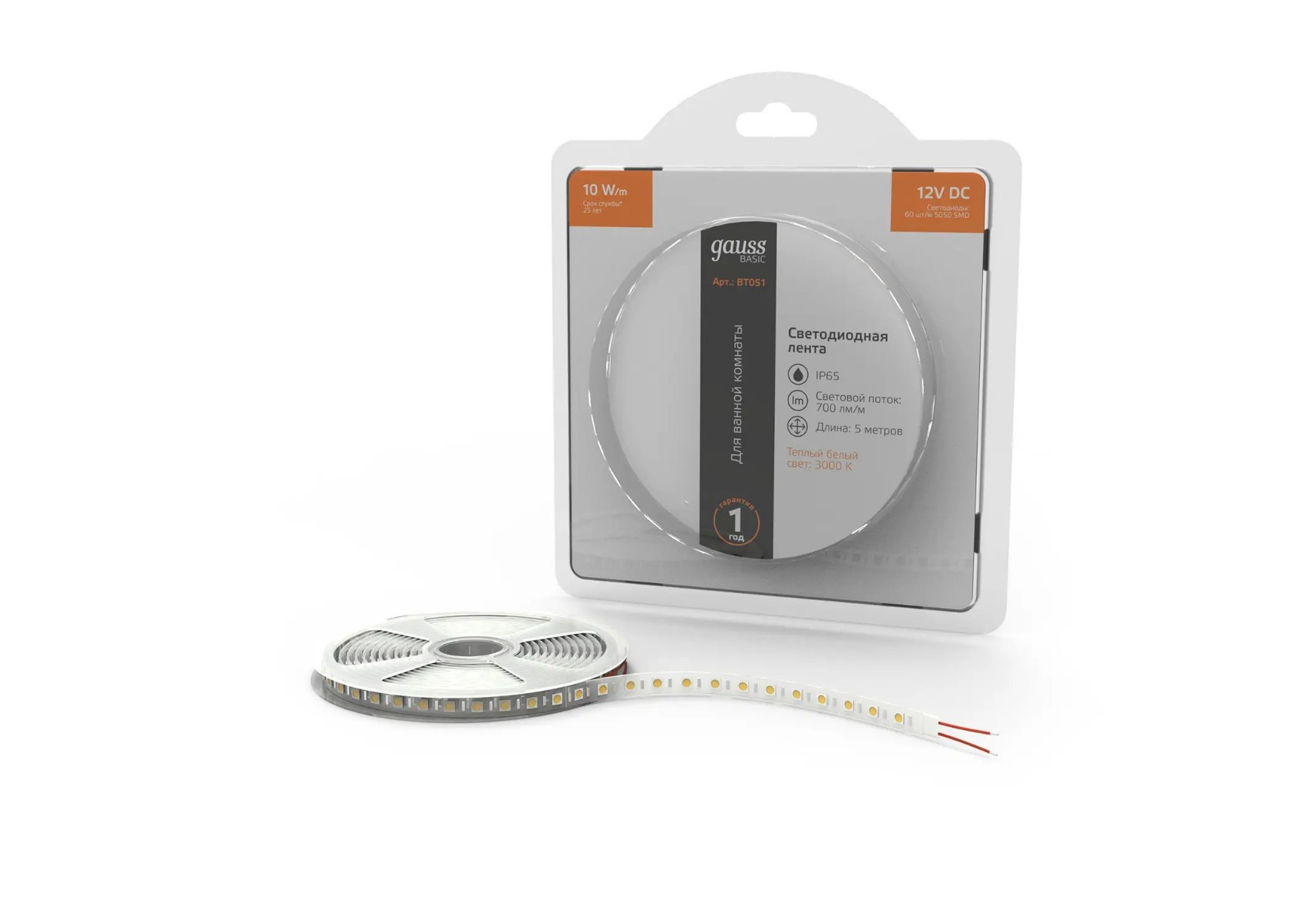 Светодиодная лента Gauss 10W/m 60LED/m 5050SMD теплый белый 5M BT051