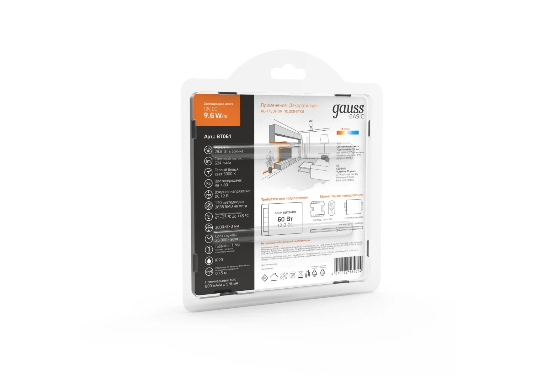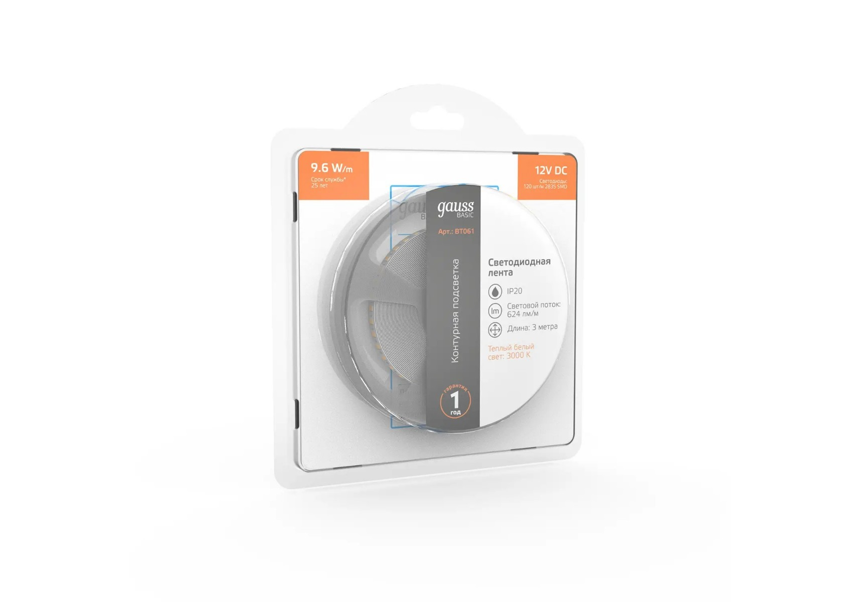Светодиодная лента Gauss 9,6W/m 120LED/m 2835SMD теплый белый 3M BT061