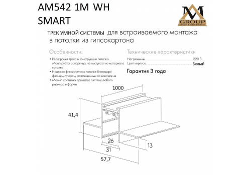Шинопровод встраиваемый AM Group AM542 1M WH SMART