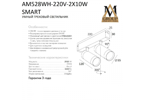 Трековый однофазный светильник AM Group AM528 WH-220V-2X10W SMART