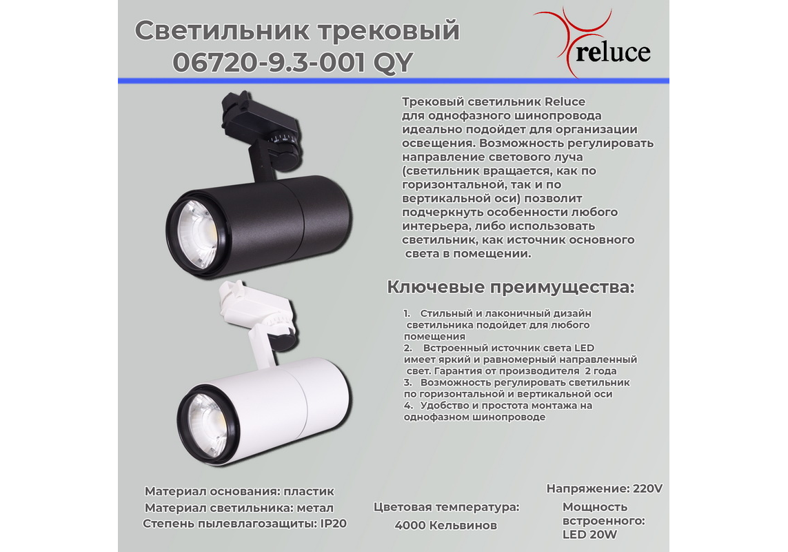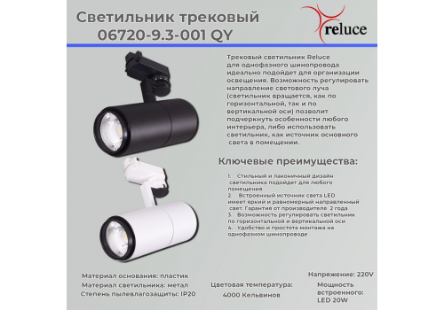 Трековый однофазный светильник Reluce 06720-9.3-001QY LED20W BK