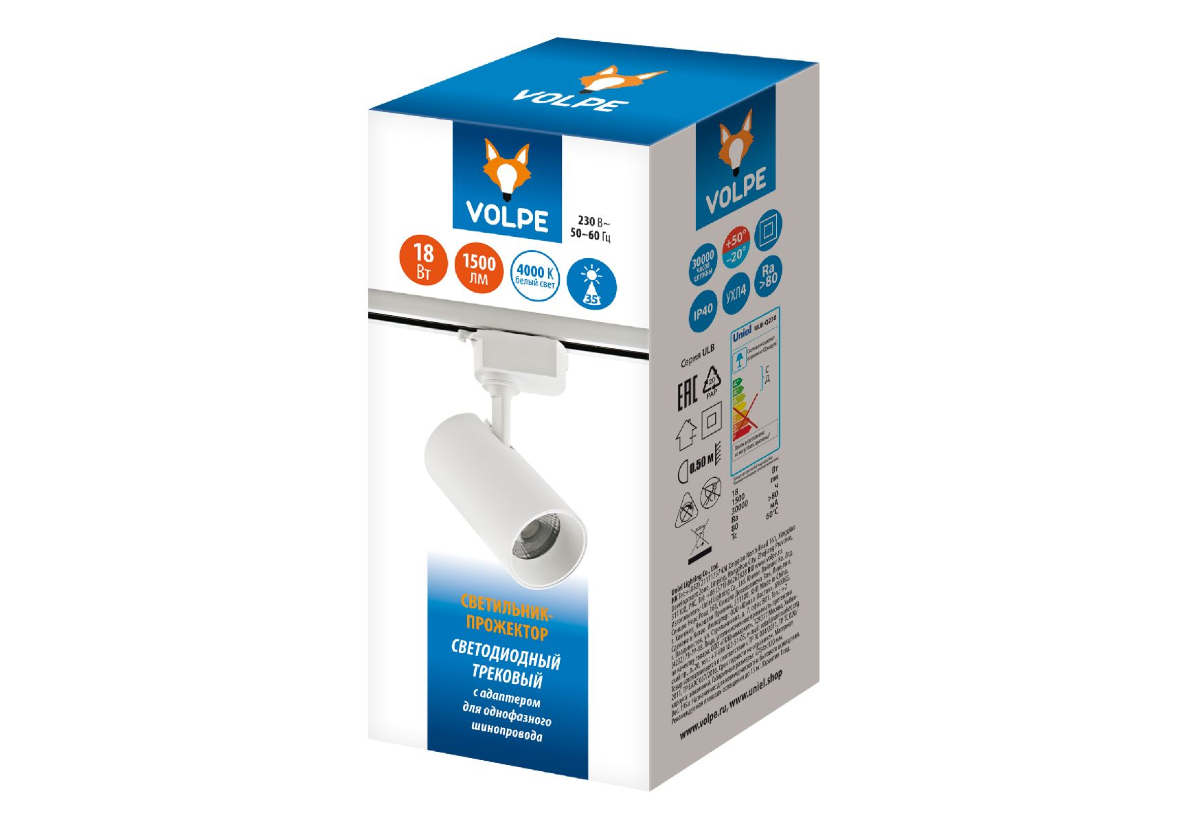 Трековый однофазный светильник Volpe ULB-Q230 18W/4000К WHITE UL-00011822