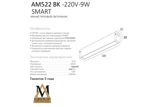 Трековый светильник AM Group Smart Opal AM522 BK-220V-9W SMART